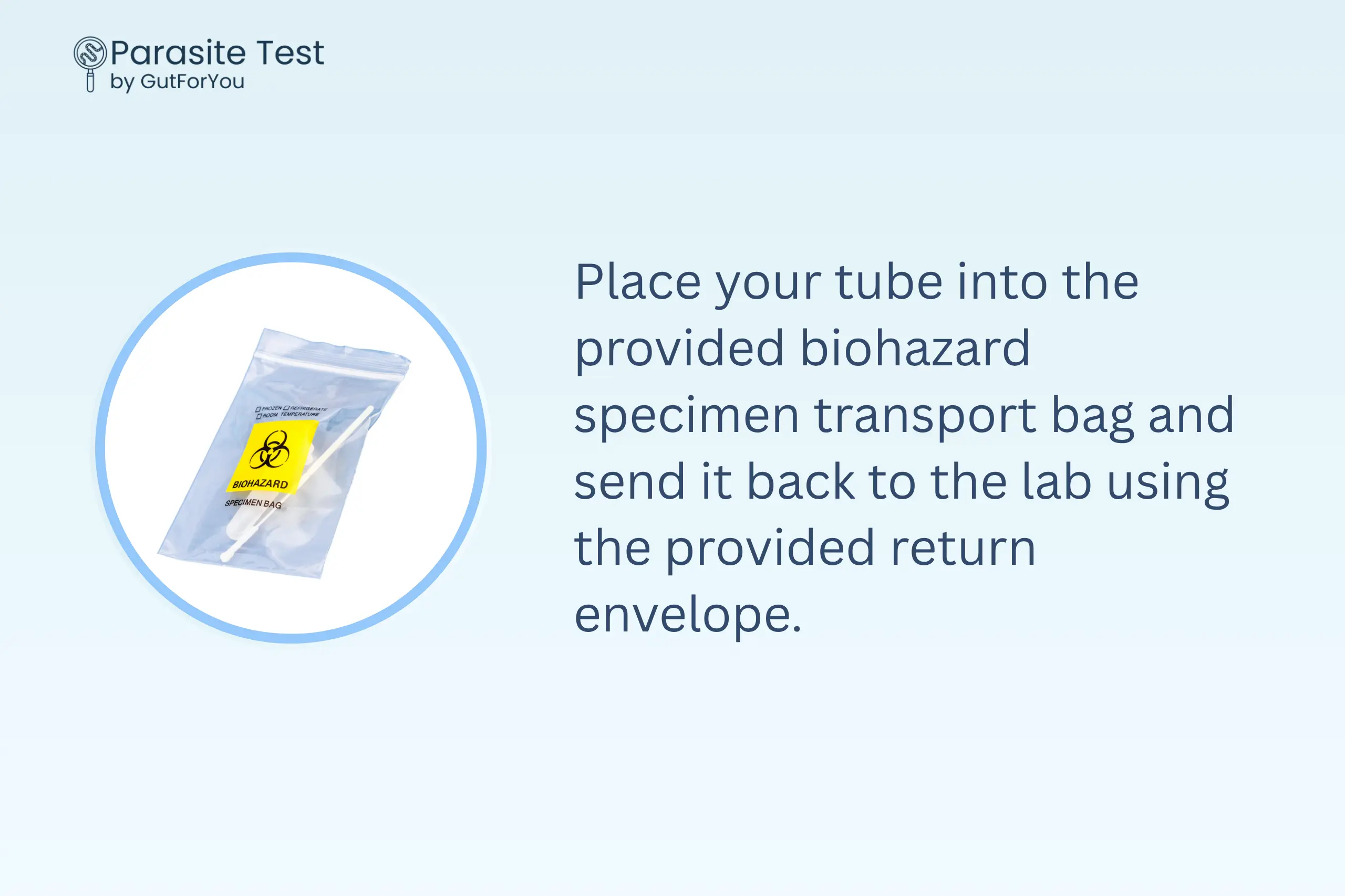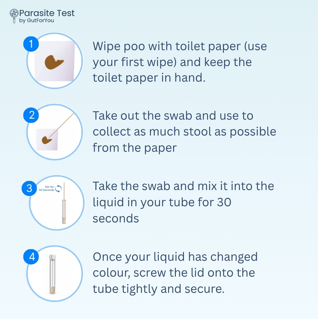 After receiving your parasite kit, open the sterile swab and the screw top tube with DNA stabilizer. When you use the bathroom, collect a small stool sample using the swab from the toilet paper (use your first wipe). Place the swab into the tube, mix for 30 seconds, and seal the tube.